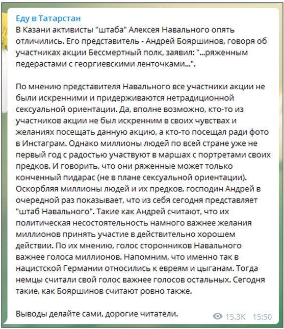 В преддверии акции «Бессмертный полк», которая собрала в Москве и Петербурге более 2 млн. человек, сторонник Навального из Казани Андрей Бояршинов грубо выругался в сторону россиян: