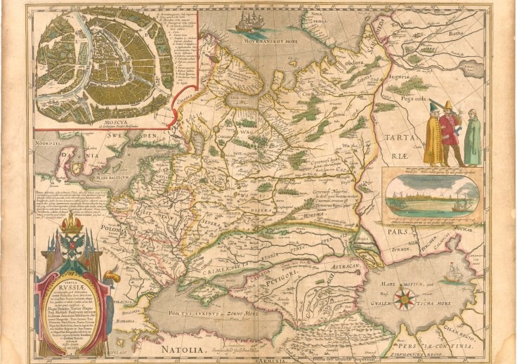 Tabula Russiae — единственная карта России из 12-томного Атласа Блау (Голландия), 1667 г. В тогдашних представлениях европейцев, Сибирь — это небольшая область в районе Воркуты, а Байкал («Китайское озеро») находится на месте нынешнего Уренгоя. Для сравнения: Германии в атласе посвящено 96 подробных карт, а Бельгии и Нидерландам — 63