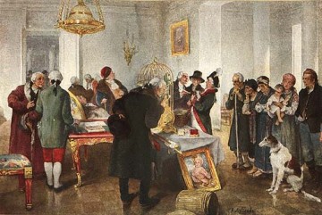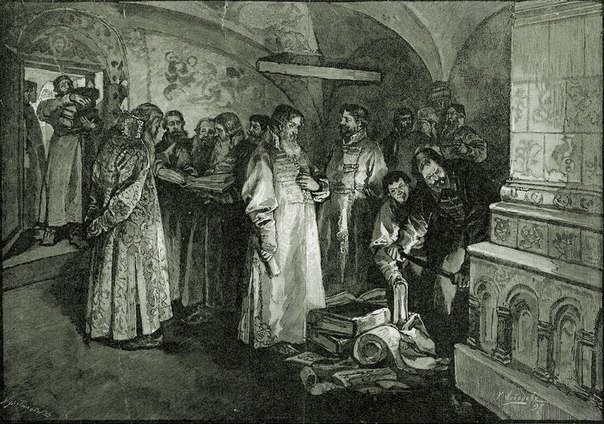 По распоряжению царя Фёдора Алексеевича, старшего брата Петра I, в печке жгут разрядные книги, 1682 г. Так была ликвидирована система распределения должностей в зависимости от знатности рода.