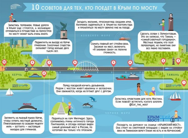 Выезжая из Керчи, строители советуют подмигнуть установленным фигурам сказочных существ — грифонам. Последний, десятый, совет связан с пожеланием запастись терпением, так как новые дороги в Крыму еще строятся, а желающих отправиться в путешествие по мосту может быть очень много.