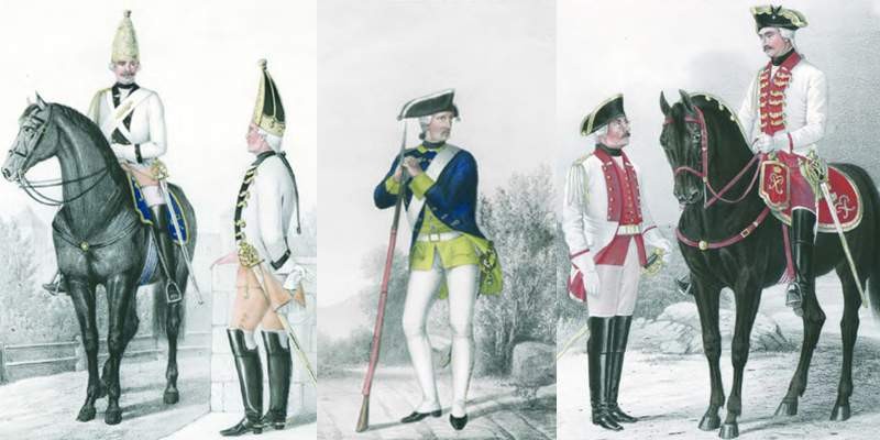 Гренадер и гренадерский офицер, рядовой мушкетерского полка, рядовой и офицер кирасирского полка