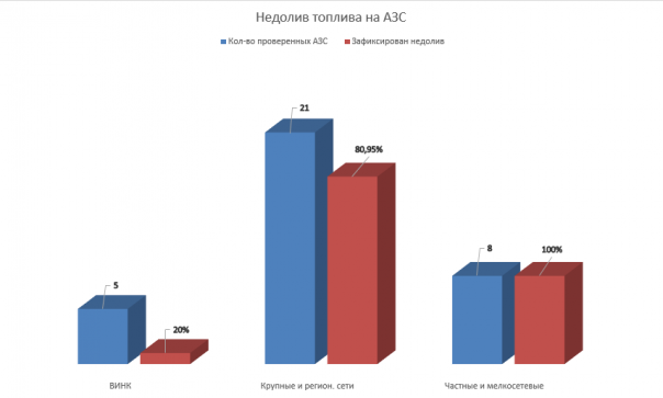 Согласно нашему методу, за недолив принималось расхождение более 1 %, между оплаченным и фактически полученным топливом. В результате недолив выявлен на 76% АЗС. Недолив среди ВИНКов составил 20% , один из пяти ( недолив 1,63% — на уровне погрешности). Недолив среди федеральных и крупных региональных сетей составил 81% (средний недолив 4,97%, max 19.03%). Недолив среди мелкосетевых и частных АЗС составил 100% (средний недолив 5,66%, max 8.03%). Средний недолив по выборке составил 5,05%, а значит, его фактически можно приплюсовать к цене за литр.