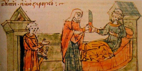 Рогнеда пытается убить мужа. Миниатюра Радзивилловской летописи