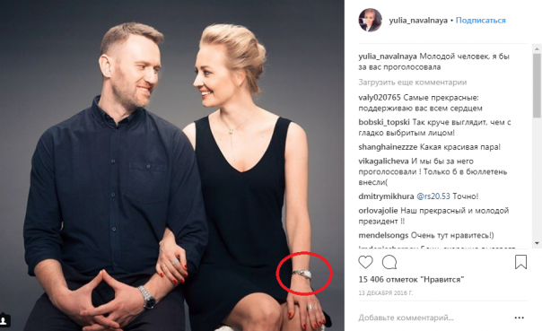Впрочем, это не единственные дорогие часы, которые есть у безработной жены Навального. Как оказалось, Юлия располагает солидным выбором дорогих аксессуаров, по всей видимости, подаренных мужем. Вот фото от декабря 2016-го года: