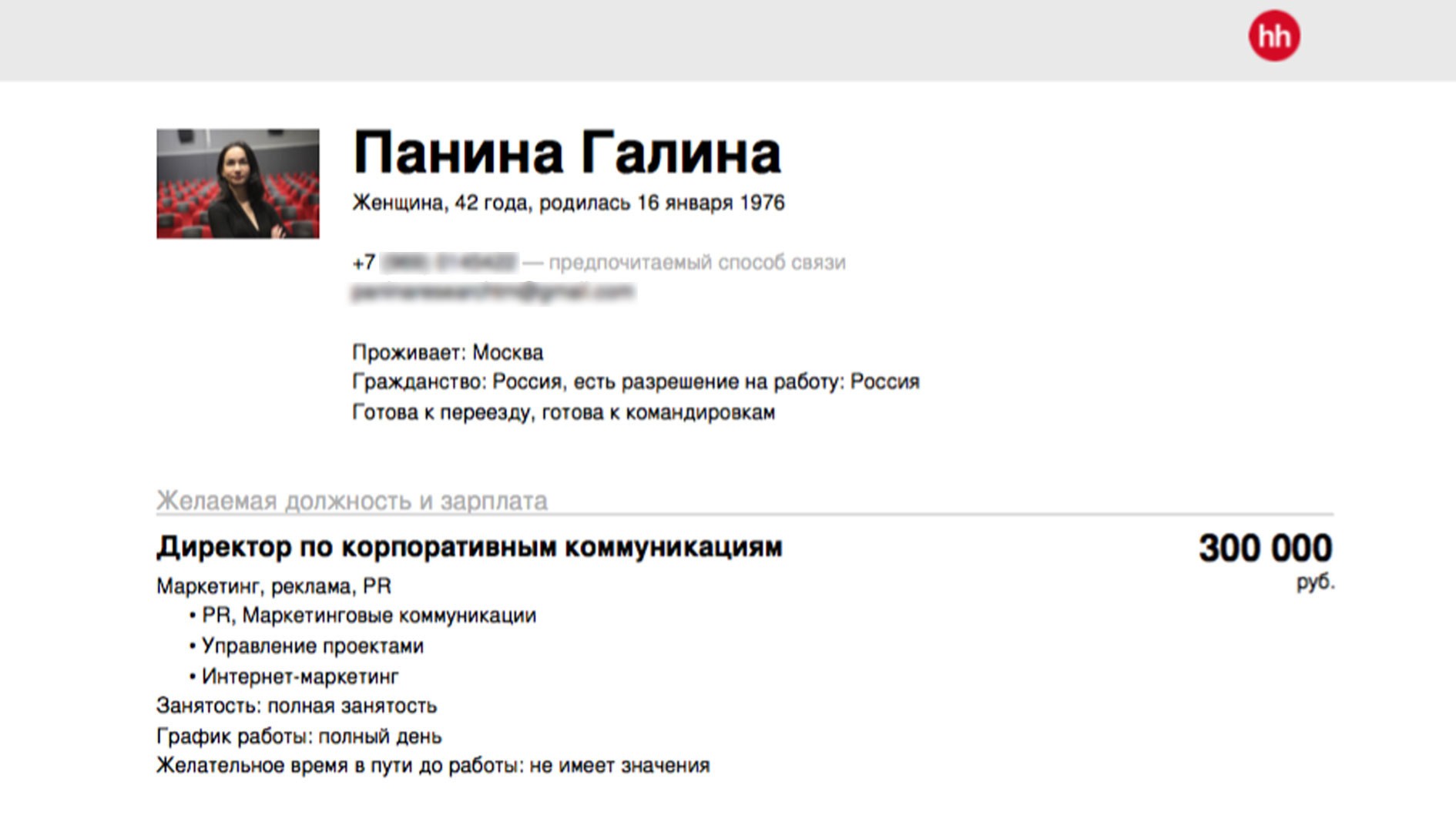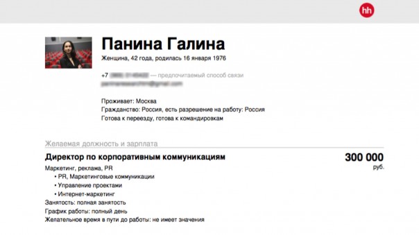 Бывшая пиарщица компании "Леруа Мерлен" Галина Панина разместила на сайте поиска работы HeadHunter резюме, где ищет должность директора по корпоративным коммуникациям с окладом в 300 тысяч рублей. Объявление доступно лишь для официально зарегистрированных организаций.