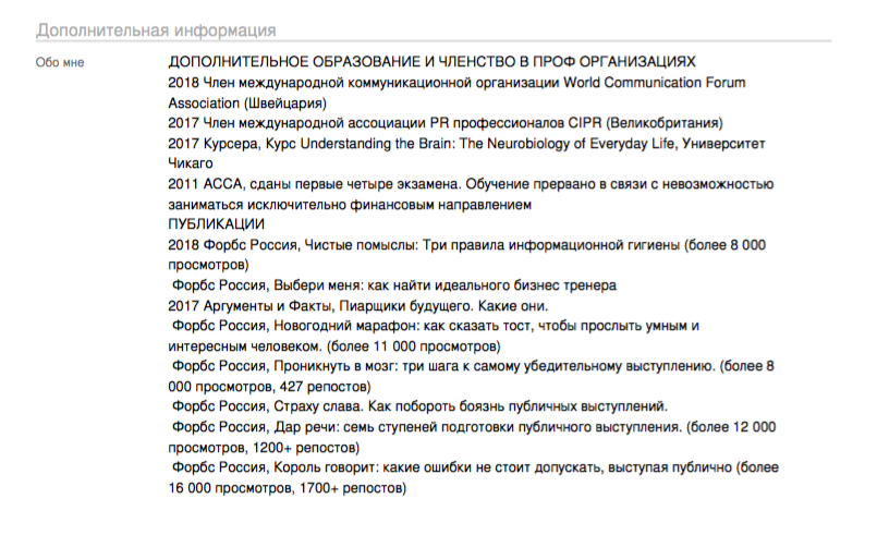 Среди навыков Панина отметила, что умеет организовывать пресс-конференции, работать со СМИ, подготавливать комментарии для прессы, имеет контакты с журналистами. Владеет свободно русским и английским языками, а на французском может провести интервью.
