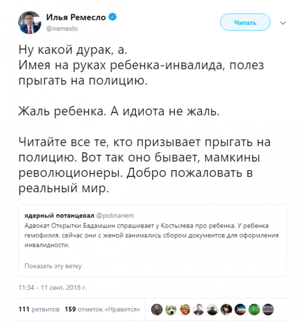 То есть представьте себя на месте этого Костылева. У вас на руках ребёнок, больной гемофилией. Вы с женой собираете документы для оформления инвалидности. У вас есть работа, есть пожилые родители, требующие внимания. Ииии… вы идёте на митинг, чтобы подраться там с сотрудниками Росгвардии.