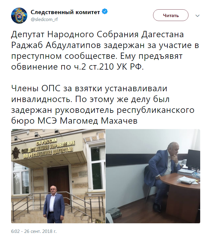 По данным СКР, участники преступного сообщества за взятку ставили инвалидность. По делу о членстве в ОПС задержан и руководитель республиканского бюро МСЭ (медико-социальной экспертизы) Магомед Махачев.