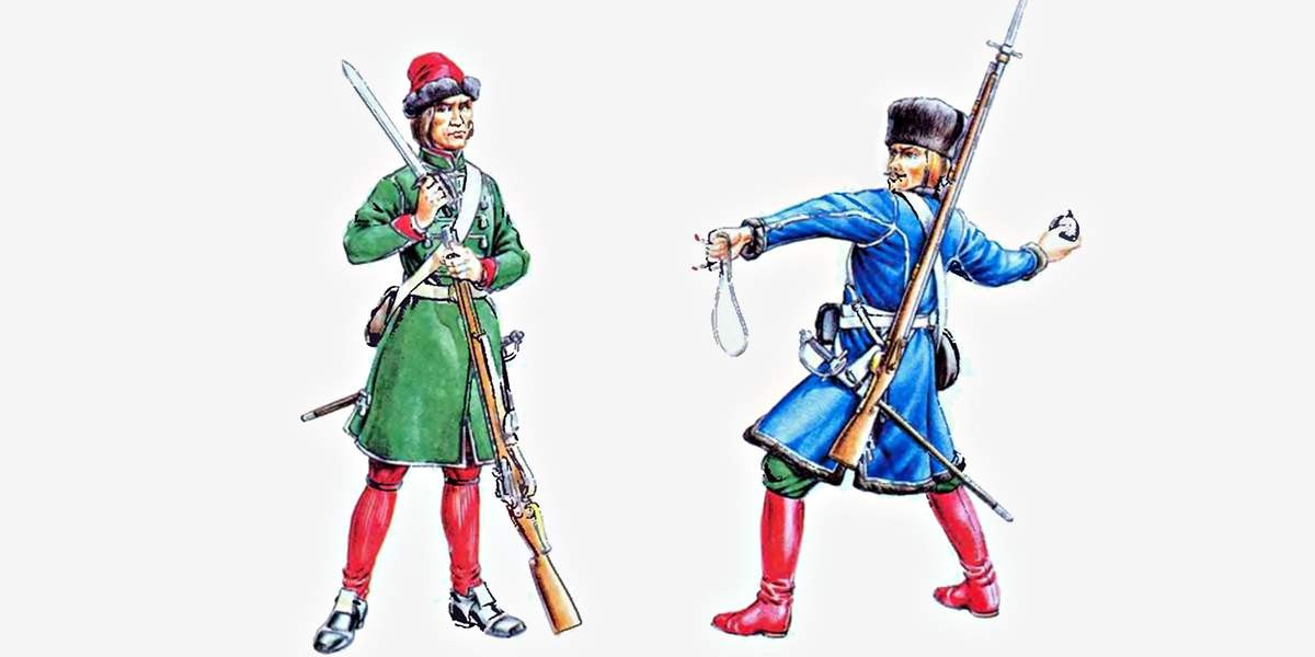 Первоначально гвардейские гренадеры отличались богатыми шапками из медвежьего меха, но после 1707 года их заменили на кожаные каски с медным налобником и страусовым пером. Эти шапки превратились в настоящий символ петровской гвардии и продержались до 1796 года.