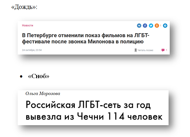 Нет сомнений, что в конкурсной гонке примут активное участие «Дождь», «Сноб», «Медуза», «Бумага», The New Times, в которых эта тема разрабатывалась давно. Вот типичные заголовки из этих изданий: