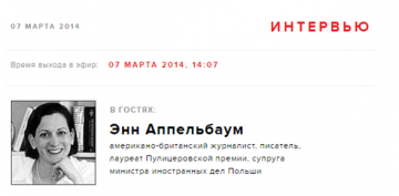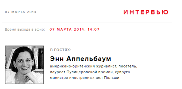 Далее по списку Энн Аппельбаум. Тут все просто: является женой польского министра иностранных дел и имеет славу ангажированного журналиста с антироссийским душком. Раздает на «Эхе» интервью.