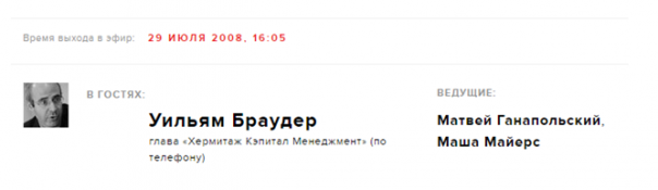 Следующим любимчиком «Эха Москвы» является Уильям Браудер, финансист, международный мошенник, гражданин Великобритании, разумеется. В 2017 году был включен нашей страной в список розыска Интерпола. В том же году был заочно приговорен к 9 годам заключения за неуплату налогов.
