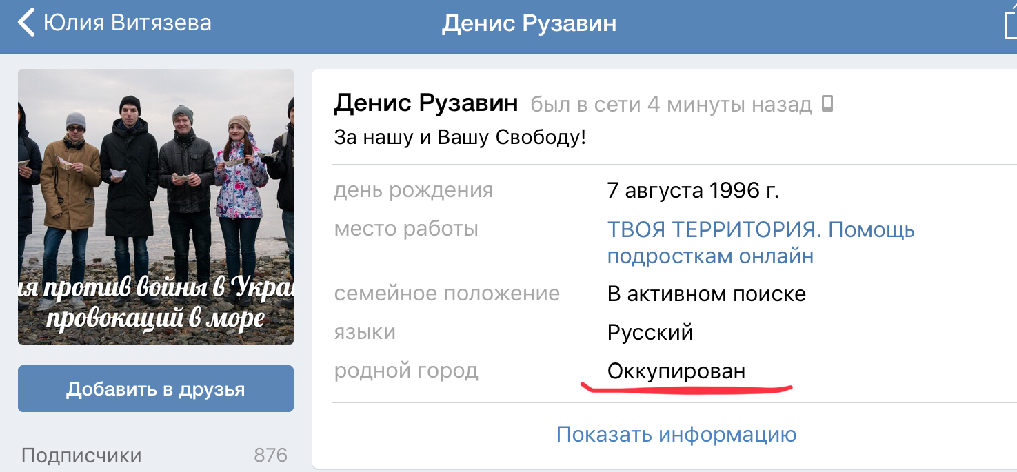 Мы с содроганием сердца следим за сводками из АТО и воспринимаем как личную трагедию подлое, гнусное нападение российских кораблей на мирно шедшие в полную гавань украинские суда. Если мы не будем солидарны с Украиной, если не будем выходить на митинги, пикеты, акции — мы превратимся в животных, перестанем быть людьми. Выразить своё несогласие с преступной оккупационной властью — долг каждого гражданина России. Путин — это не Россия, а «мотороллы» и «бабаи» - это не русские.