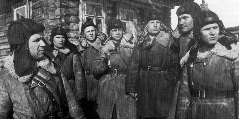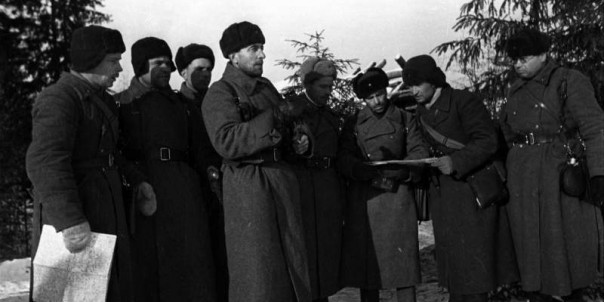 Командир 4-й танковой бригады генерал-майор Михаил Ефимович Катуков с офицерами за обсуждением предстоящих боев у карты