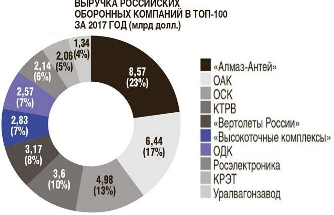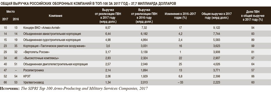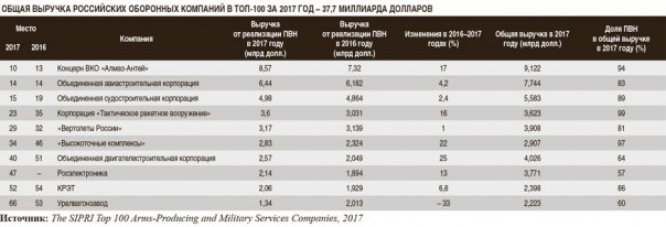 Возглавляет список российских предприятий в рейтинге Топ-100 SIPRI Концерн ВКО «Алмаз-Антей», выручка которого от реализации ПВН в 2017 году – 8,57 миллиарда долларов (7,32 млрд долл. в 2016-м). Общая прибыль компании достигла 9,122 миллиарда долларов, то есть доля оборонной продукции – 94 процента.