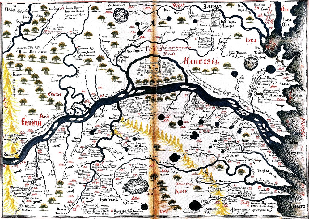 Карта города Новая Мангазея (современный Старотуруханск) с окрестностями конца XVII века из «Чертежной книги Сибири, составленной тобольским сыном боярским Семеном Ремезовым в 1701 году», Санкт-Петербург, 1882