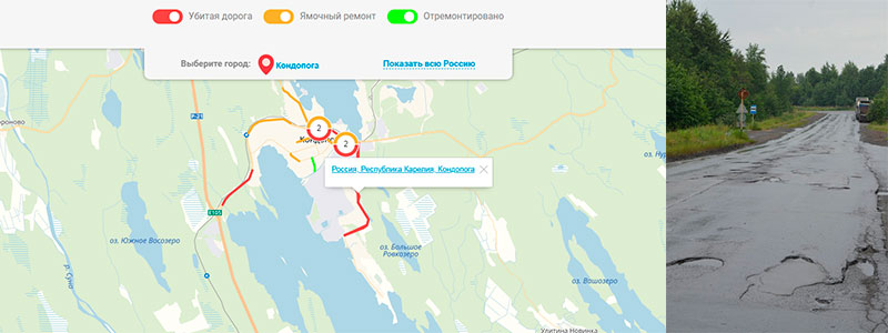 «Дорожная инспекция ОНФ / Карта убитых дорог — проект Общероссийского народного фронта, направленный на учет мнения граждан в сфере ремонта дорог. Наша общая задача — это обратить внимание чиновников на улицы, которые прежде всего значимы для жителей. На карте отмечаются дороги, находящиеся в плохом состоянии. Отмечая дорогу на карте и формируя ее рейтинг посредством голосования за нее на сайте, вы сможете повлиять на включение дороги в планы ремонта».