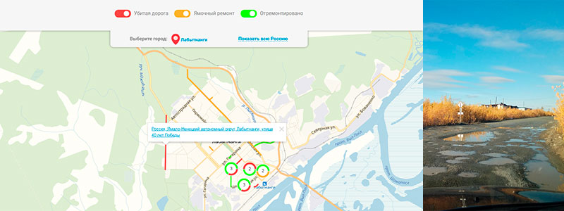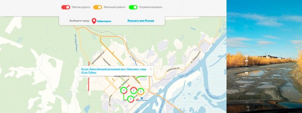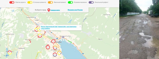 Общероссийский народный фронт, этот аналог «Народного контроля» в советское время, развивает очень любопытный проект: Дорожная инспекция ОНФ / Карта Убитых Дорог. По-моему, очень перспективное начинание.