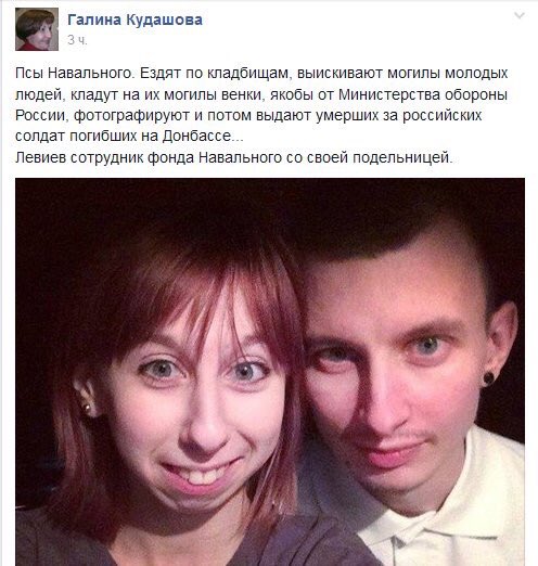 "Псы Навального. Ездят по кладбищам, выискивают могилы молодых людей, кладут на их могилы венки, якобы от Министерства обороны России, фотографируют и потом выдают умерших за российских солдат погибших на Донбассе Левиев сотрудник фонда Навального со своей подельницей."- сообщила бдительная гражданка Галина Кудашова о непотребстве творимом "внучкой блокадницы". Источник