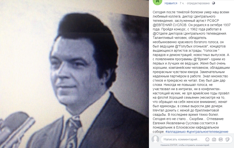 "Сегодня после тяжелой болезни умер наш всеми любимый коллега, диктор Центрального телевидения, заслуженный артист РСФСР Евгений Суслов", — написала Данько.