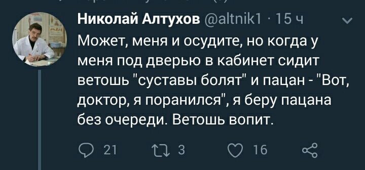 Даже постоянные читатели микроблога Алтухова восприняли его слова негативно: "Вы точно врач? Просто не верится", "Непедагогично по отношению к ребёнку (учите его пренебрежению к старости), а к пожилому человеку относитесь оскорбительно и высокомерно об этом в твиттере с гордостью пишите", "Хмммм. У меня вот суставы стали побаливать. То плечевой, то коленный, к врачу никак не дойду. Теперь вот осознала, что я — ветошь, поэтому действительно не стоит идти. Да, и поясните, а ветошь — это с какого возраста?", "Скажем так: будь я матерью, я бы своего пацана такому «доктору» не доверила бы", "Старики — мусор? Выжатый лимон? Желаю вам дожить до такой же «заботы»", "И Вы когда-то станете ветошью. А бумеранг имеет свойство возвращаться", "Извините, но Вы — редкостная сволочь. У моей мамы, например, болят суставы, так что я знаю, что это такое. И ей действительно бывает тяжело ждать в коридоре — в отличие от «пацанов» с их пустяковыми травмами (если травма не пустяковая, то не идут к врачу, а вызывают скорую)", "Да вы ничем не лучше доктора Менгеле. Жаль, у нас в стране не дисквалифицируют моральных уродов, как вы", "Ты не врач после слова «ветошь», делить людей на сорта — это фашизм. Помощь бывает нужна всем и таким, как ты, в первую очередь. Мозгов мало, а души нет совсем. Нарыв на медицине", "Не знаю, как там у врачей принято, но нормальный человек такое не напишет", "А может вам пацанчеги нравятся просто?", "И какой же вы врач? Про клятву Гиппократа не буду", "Ветошь всю жизнь пропахала во вредном цеху, или, как я, полевым геологом на Крайнем Севере. А бычок пальцы гнул и получил звиздюлей от таких же бычков. Так что, если я ветошь с больными суставами, то ты не доктор, а экскремент", "Судя по вашему фото на аватаре, вы сами от «ветоши» буквально в двух шагах находитесь. Желаю вам, в случае чего, к таким врачам, как вы, попадать на приём в поликлиниках", "Мужик, ты вечный что-ли?! Нет? Тогда желаю тебе отзывчивых докторов в ближайшем будущем", "Семь веков себе отмерил? Не прокатит, станешь и ты «ветошью». А я тебе желаю повстречать своего Николку Алтухова, когда время »ветоши» наступит".