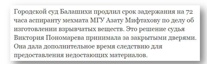 При этом авторы издания ни слова не говорят о том, что в ходе обыска в комнате Мифтахова были обнаружены следы взрывчатки, армейская одежда, рации, телефоны и экстремисткая литература. Так же, как и о том, что он является членом анархистской организации и в 2018 году приговаривался к штрафу за применение насилия в отношении полицейского.
