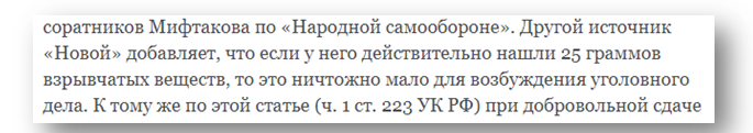 В другом своем материале «Новая газета» писала, что обнаруженные у задержанного 25 граммов взрывчатого вещества не являются достаточным основанием для возбуждения уголовного дела.