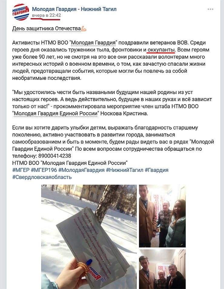 Вдумайтесь только в смысл этого поста: фронтовиков и тружеников тыла поздравляют вместе с оккупантами. И всё это - от организации, которая названа "Молодой Гвардией".