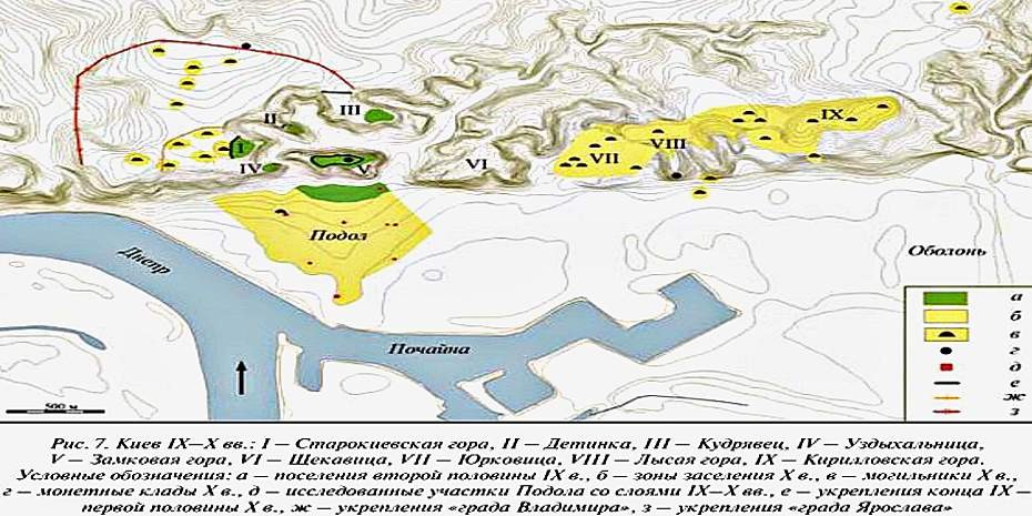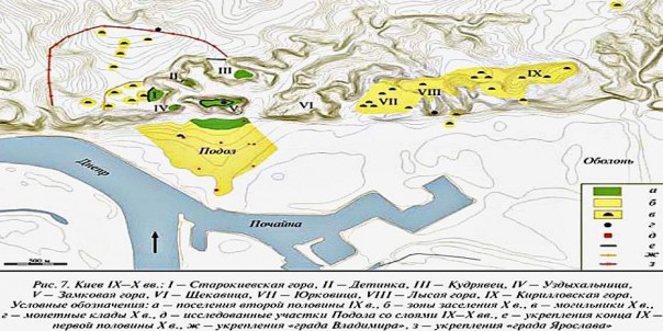 Справка. В Киеве в конце IX века начинает заселяться и Подол. Причём там строятся уже не полуземлянки, типичные для Поднепровья, а срубы, характерные для северных районов (дендродата даёт 887 год). Тогда же, на рубеже IX–X веков, появились укрепления. Ров на Старокиевской горе в X веке дважды забрасывали, но затем вновь восстанавливали и расширяли.