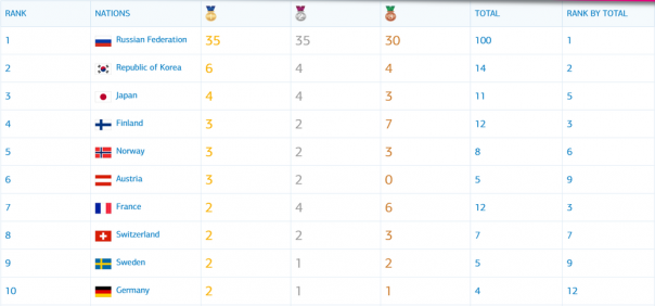 29. 2019. Россия. На 9 марта – 1 место – Россия (96 мед.); 2 место – Южная Корея (13 мед.)