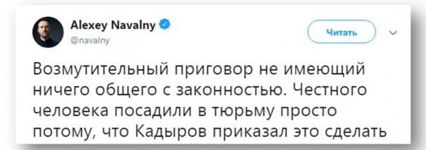 На эту новость сразу же откликнулся блогер Алексей Навальный, назвавший Титиева «честным человеком». Приговор, по его мнению, «возмутительный».