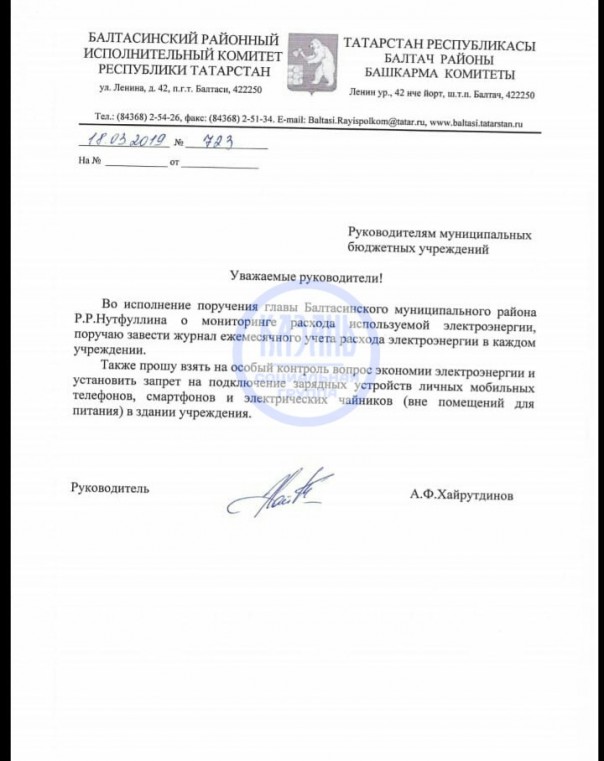 О странной экономии в бюджетных учреждениях Татарстана начали писать обеспокоенные пользователи в соцсетях. В пабликах выложили официальное распоряжение главы Исполкома Балтасинского района о запрете зарядки мобильных телефонов, смартфонов и электрических чайников в зданиях муниципальных учреждений, в том числе школ и больниц, в целях экономии.