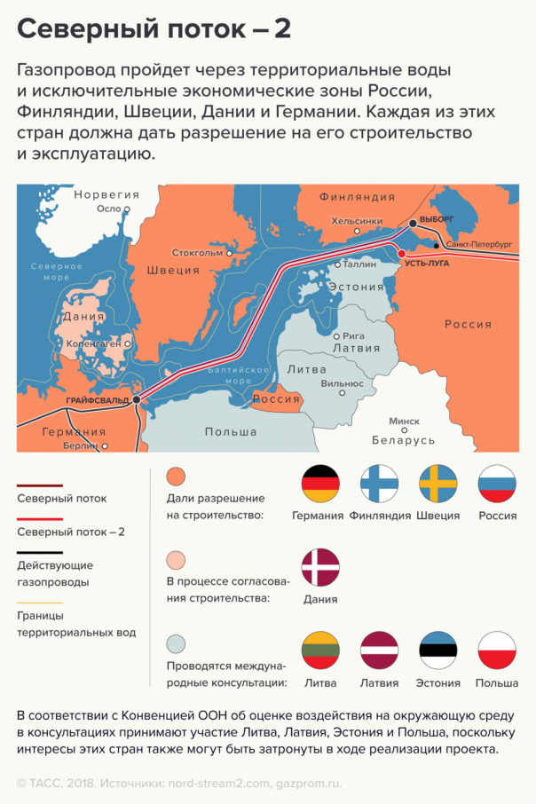 Проект строительства магистрального газопровода по Балтийскому морю из России в Германию является наиболее известным и даже скандальным. Америка, в желании продавать партнёрам собственный сжиженный газ, пугает Европу серьёзным ростом российского политического влияния на ЕС в случае реализации этого проекта, но заинтересованность России, прежде всего, обусловлена экономическими интересами. Трубопровод протяжённостью свыше 1200 км сможет обеспечивать газом всю Европу, а Владимир Путин смог добиться гарантий строительства «Северного Потока-2», несмотря на нападки Соединённых Штатов и их союзников. На 13 марта 2019 года построено свыше 830 км трубопровода, а это 34% от общей длины по двум его ниткам. Окончание работ по укладке труб запланировано уже на декабрь текущего года.
