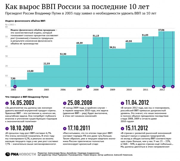 Скажем прямо – никто не ставил на Россию, когда её внешний долг составлял 140% от ВВП. Да и объемы валового внутреннего продукта в то время упали в два раза. На этом фоне амбициозная задача Путина удвоить ВВП, которую он анонсировал в 2003 году, казалась неправдоподобной. Но на 2014 год этот рост составил 94%.