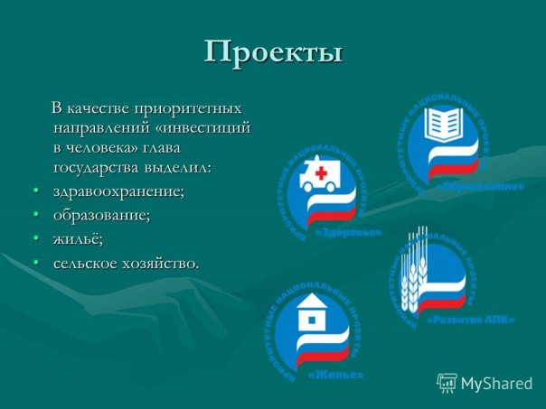 «Здоровье» - повышение качества и доступности медицины, снижение уровня заболеваемости, инвалидности и смертности, развитие высокотехнологической медицинской помощи и помощи на догоспитальном уровне, и многое другое.