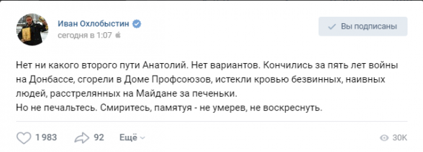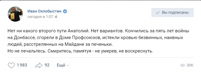 "Нет вариантов. Кончились за пять лет войны на Донбассе, сгорели в Доме Профсоюзов, истекли кровью безвинных, наивных людей, расстрелянных на Майдане за печеньки. Но не печальтесь. Смиритесь, памятуя — не умерев, не воскреснуть", — написал актер.