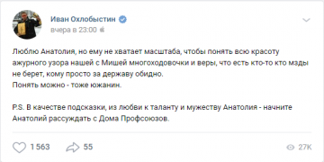 "Понять можно — тоже южанин. P. S. В качестве подсказки, из любви к таланту и мужеству Анатолия — начните, Анатолий, рассуждать с Дома Профсоюзов (гибель сторонников "антимайдана" в Одессе 2 мая 2014 года. — Прим. ред.)", — добавил Охлобыстин.