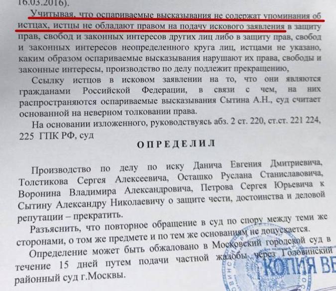 Я напомню, что суд тогда отклонил наши иски. Мне и другим было отказано потому, что суд счёл, что заявления Сытина о «национальной склонности русских к лени, насилию, пьянству и кровосмешению» и о том, что Россия – это якобы «террористическое государство», не касаются лично нас.