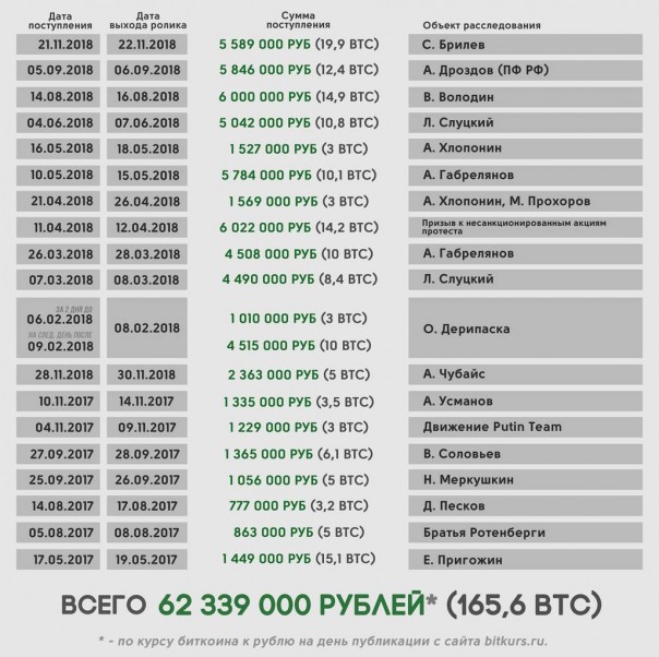 В таблице собраны факты единовременного поступления крупных сумм в биткоинах на кошельки Навального и даты публикаций компрометирующих видеоматериалов на его канале.