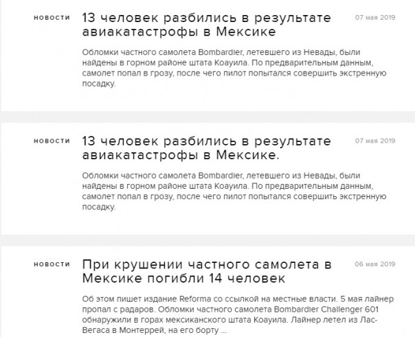 Вчера репостнул на АШ новость о том, что в Мексике упал и разбился самолёт канадского производства марки Bombardier летевший из США. Ну и в комментарии автора написал буквально следующее, извините за самоцитату: "русофобская ...два с Эха Москвы посвящающая по 10 новостей в сутки каждому чиху Маска ( в случае если он НЕ провален) и по 50 новостей аварии российских самолетов, вообще сообщит об этой катастрофе хотя бы 1 раз?"