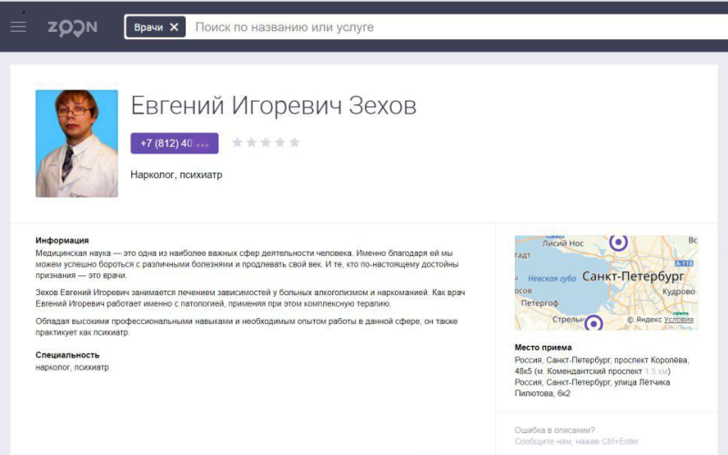 На сервисе Zoon указано, что его специализацией является лечение зависимостей у больных алкоголизмом и наркоманией. Несмотря на разоблачение обмана четы Резников, на страницах либеральной прессы и соцсетях до сих пор появляются слезные статьи о «сердечном приступе», видимо, чтобы вызвать у горожан жалость к оскандалившемуся депутату.