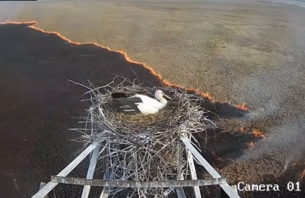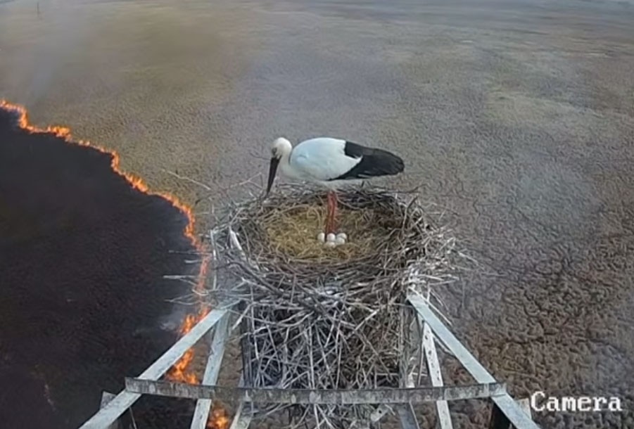 Пожары в Амурской области охватили огромную территорию: горят по меньшей мере 1,4 тысячи гектаров. Однако птицы, свившие гнездо на вышке электропередачи, хоть и проявили беспокойство из-за распространяющегося рядом огня, но решили остаться и высидеть птенцов. Первая видеозапись была сделана 28 апреля, а к 13 мая на свет появились аистята.