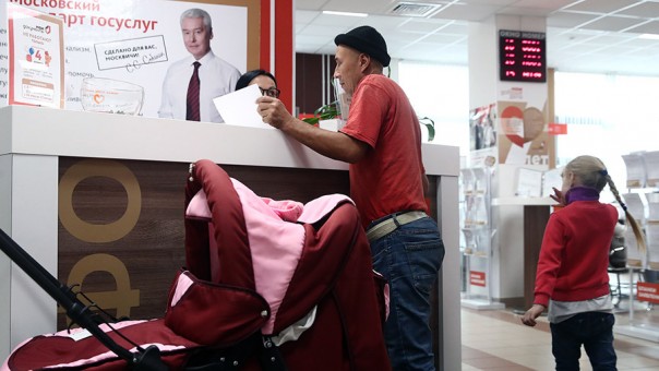 Мужчина с детьми в центре государственных и муниципальных услуг «Мои документы»