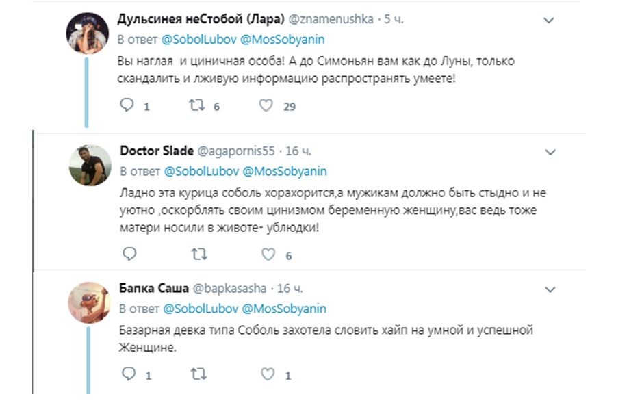 С осуждением хамского поведения Соболь по отношению к Симоньян уже выступили Мария Захарова и колумнист RT Андрей Медведев.