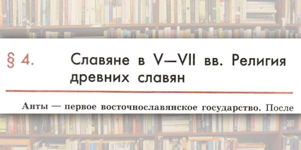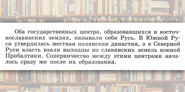 Далее учебник рассказывает об эпической борьбе норманистов и антинорманистов. Он излагает различные версии того, кто такие русы, и внезапно ставит школьника перед фактом, что это — прибалтийские славяне.