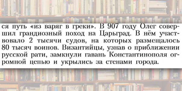 Учебник «Русского слова» обходит многие подводные камни, но один прокол всё же допускает. Он пишет, что в 971 году «в городе Доростоле войско Святослава окружила стотысячная византийская армия». Вообще, специалисты по Византии оценивают численность войска Иоанна Цимисхия в 30-40 тысяч воинов — для Средневековья это очень много! А цифру сто тысяч взяли из ПВЛ.