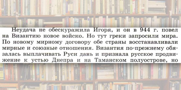 К этому учебнику можно придираться даже по мелочам. Например, в нём утверждается, что по договору 944 года «Византия по–прежнему обязалась выплачивать Руси дань».