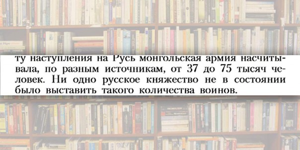 Учебник «Просвещения» пишет, что «к моменту наступления на Русь монгольская армия насчитывала, по разным источникам, от 37 до 75 тысяч воинов». Откуда взяты эти цифры, не вполне ясно. Но здесь несомненный плюс — нет привычных нам 120-140 тысяч, которые кочуют по страницам книг, как монголы по степи.