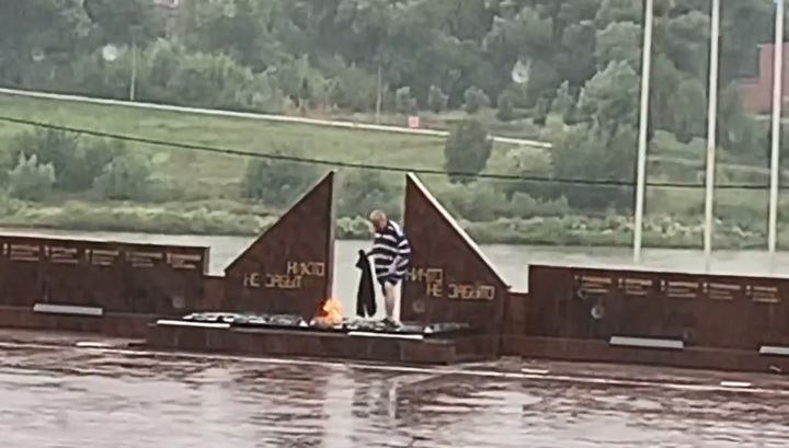 Очевидцы запечатлели на видео неадекватное поведение мужчины, решившего просушить вещи на мемориале "Вечный огонь" на площади Победы в Подмосковном Раменском.