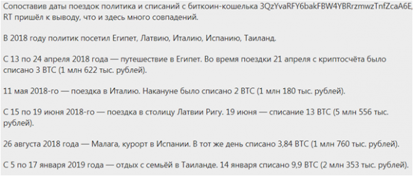 Вообще, связка Навальный-биткоины в последнее время у всех на слуху. Достоянием гласности стала информация о том, что после громких заказных расследований на блокчейн-кошелек блогера приходит довольно внушительная сумма в биткоинах, которую он потом обналичивает и мчит с семьей отдыхать. География путешествий внушительна - Таиланд, Турция, Италия и многие другие страны, где Навальные шиковали и тратили нечестно заработанные миллионы.